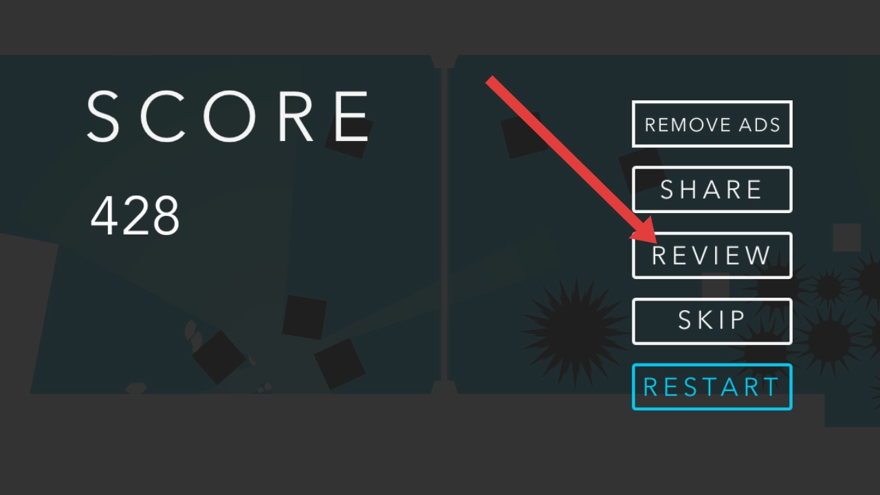 3、完成关卡挑战后,结算界面会呈现得分与完成情况,这时点击箭头所指的【REVIEW】按钮,就能进入游戏回顾界面。