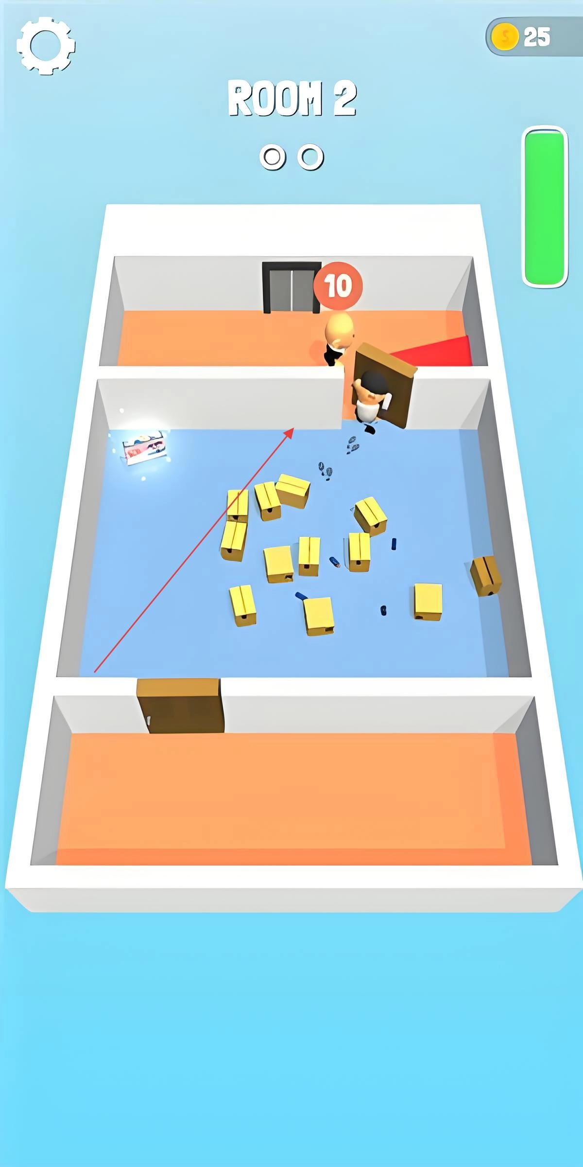 进入游戏后,先在武器库挑选初始手枪;通过滑动屏幕来控制光头角色移动,点击屏幕右侧的按钮进行射击;首次挑战时,要熟悉房间内的掩体布局以及敌人的巡逻路线。