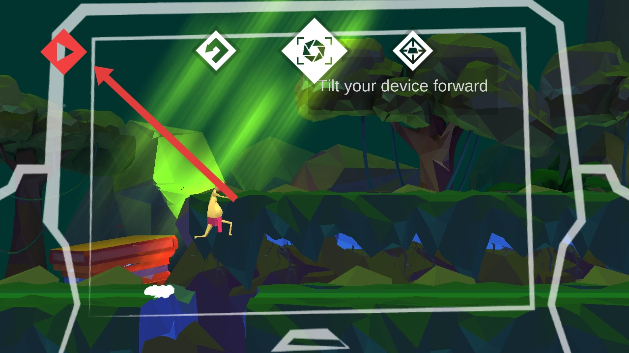 3、界面出现【Tilt your device forward】提示时,配合左上角箭头指向的按钮,倾斜设备辅助角色跨越障碍。