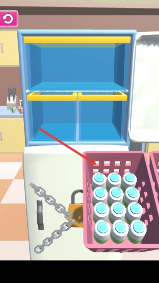 3、进阶收纳:替换物品(如绿色罐装),应对锁链等阻碍,完成冰箱收纳任务。