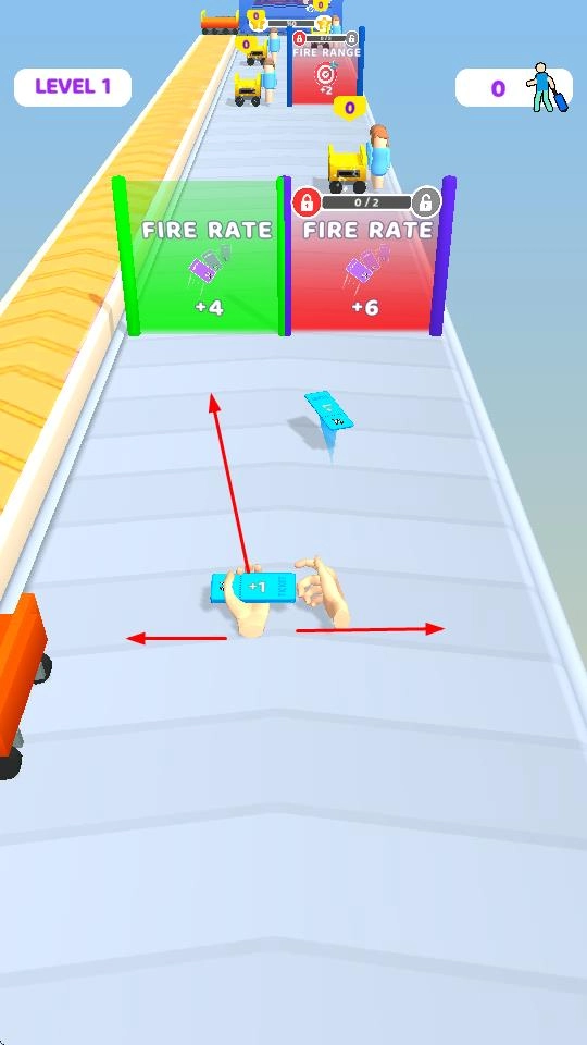 2、操控角色在跑道上左右移动,通过选择增益门来强化自身属性,过程中需要预判行进路径、做出快速决策,同时避开没有效果的区域。