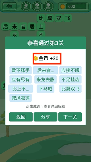 2、创新的消除类玩法,涵盖600多个精选成语,常见俗语轻松辨认,生僻典故需用心思索,隐藏成语则要达成特定条件方可解锁。