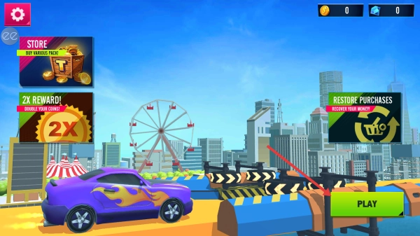 1、在主界面点击【PLAY】按钮,选择紫色赛车,开启城市赛道的挑战。