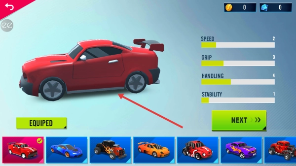 2、进入车辆选择界面后,挑选红色赛车,查看其【速度(SPEED)、抓地力(GRIP)】等属性信息,随后点击【下一步(NEXT)】按钮。