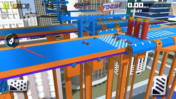 3、进行赛道驾驶时,请沿着蓝色跑道行驶,使用左侧的道具,避开障碍物并朝着【FINISH】线全力冲刺。