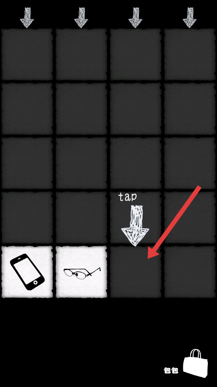 3、进入格子交互界面,点击箭头标注的“tap”下方空白格,按提示完成物品放置或收集操作,推进解谜流程。