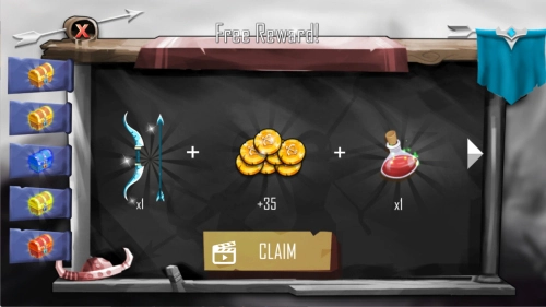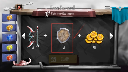 1、在“Free Reward!”界面中,点击画框所选中的盾牌道具,待观看视频后点击“CLAIM”按钮完成领取,即可获得+50防御加成与x1道具奖励。