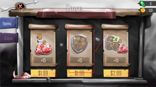 3、在商店的“Items”栏目里,选择带有画框标记、售价1.99美元的防御盾牌进行购买,完成支付后角色属性会增加15点,以此提升生存能力,更好地应对后续关卡的挑战。