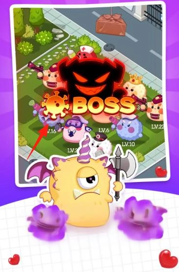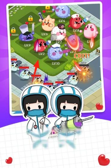 1、怪物养成玩法围绕“病毒”主题打造萌趣怪物形象(例如LV.2的粉色小怪),玩家可通过战斗(触发暴击时会显示“CRIT!”)来让怪物提升等级(最高可至LV.10)。