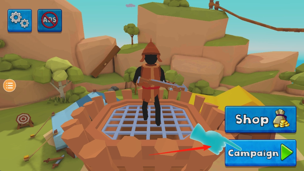 1、模式选择操作如下:在主界面找到并点击“Campaign(战役)”选项,随后进入关卡场景,此时需操控火柴人弓箭手,为射击动作做好准备。