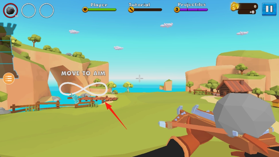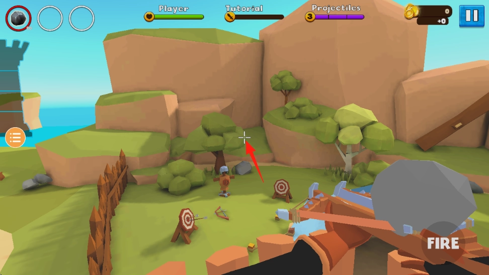 2、瞄准射击时,可通过移动操作(界面会显示“MOVETOAIM”提示)来调整弩箭的指向,对准目标(如靶子、敌人)后,点击“FIRE”按钮即可完成发射。