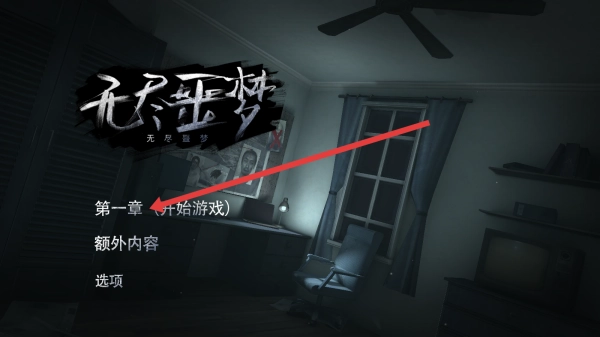 1、在主界面,选【第一章(开始游戏)】,进入恐怖解谜场景,开启“前往二楼主卧”任务。