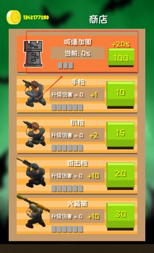 1、在商店界面选择"城墙加固"选项,花费100金币可将防御值从0%提升至20%,有效增强基地防护能力。