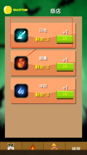 3、技能商店提供闪电、剧毒等特殊技能,每个25金币可增加使用次数,合理搭配能有效阻挡僵尸进攻。
