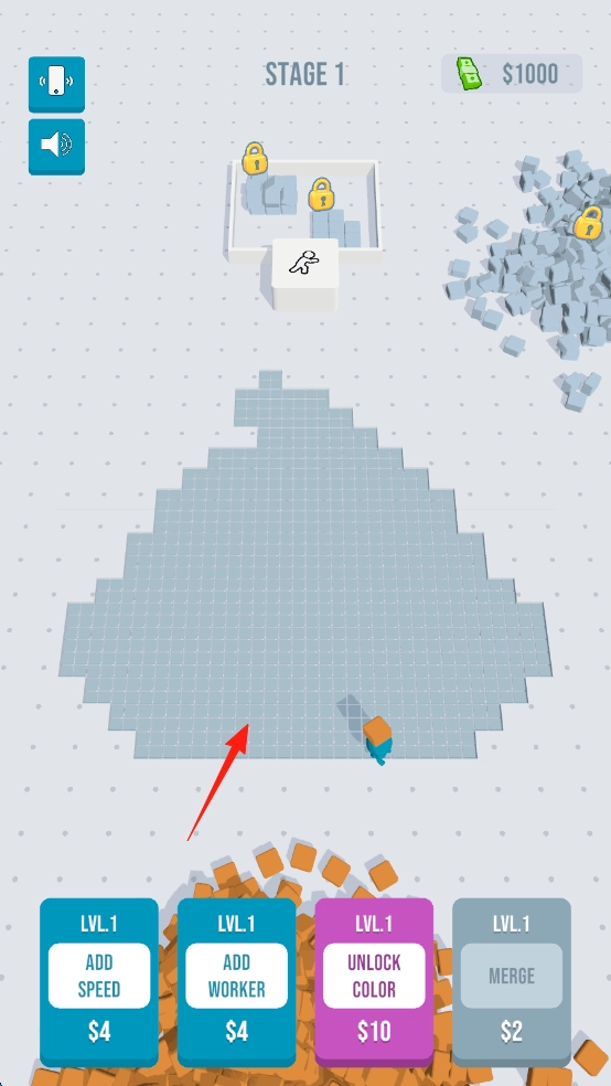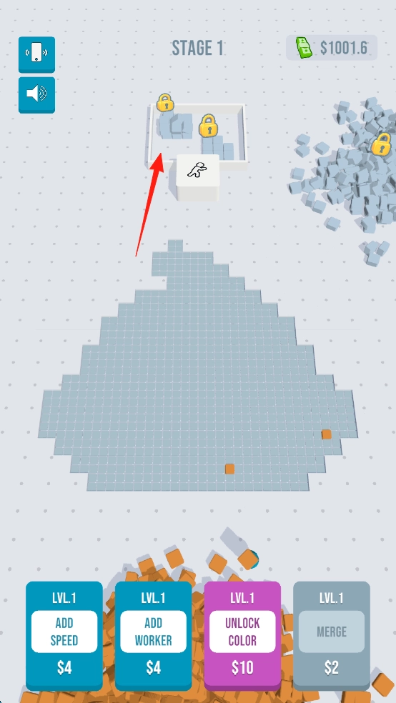 3、靠近带锁建筑(红箭头),积累足够金币($1001.6),点击【UNLOCKCOLOR】(下方),解锁新区域,扩展建造范围。