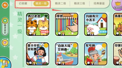 2、在精灵一级歌单中,选中两只老虎中文版开始跟唱练习。
