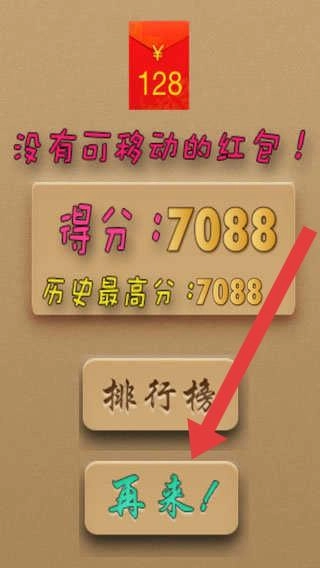 3、结算界面,若显示“没有可移动的红包”,点击【再来!】按钮,即可重新开始游戏,挑战历史最高分(7088)。