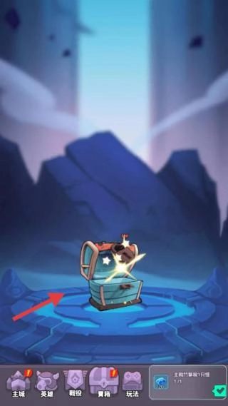 1、宝箱探索在关卡场景,点击发光宝箱,开启获取资源,推进主线(主城英雄锻纹)玩法。