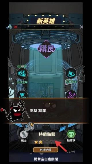 3、英雄养成获得新英雄(持盾骷髅),查看精良品质、技能(护盾值、伤害),搭配阵容战斗。