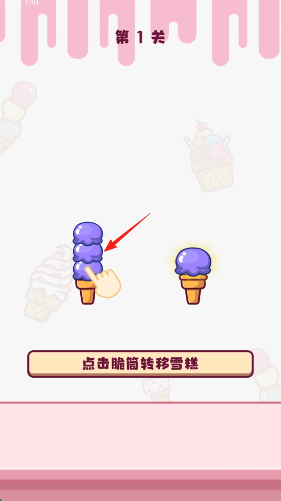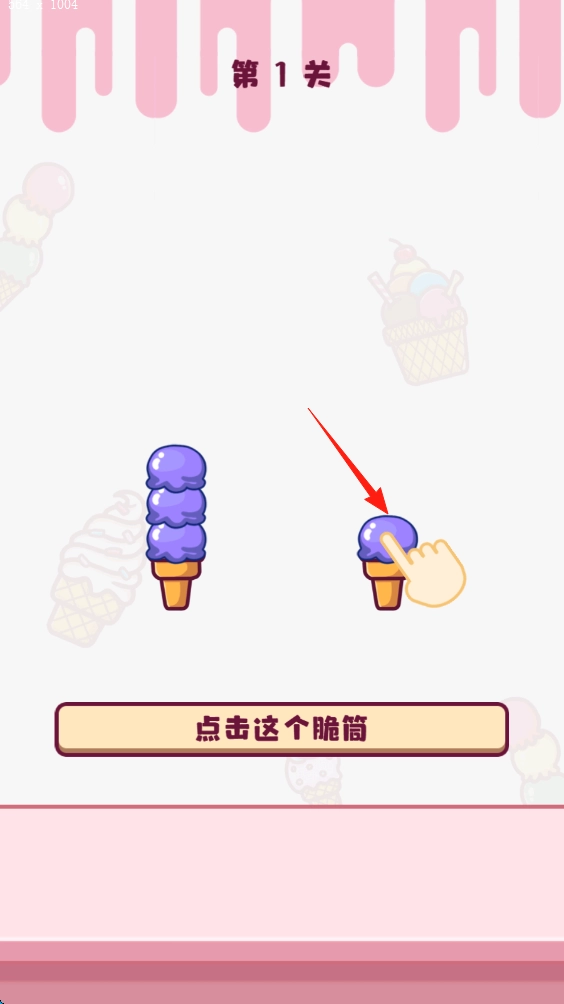 1、点击右侧单个紫色雪糕的脆筒,完成第一关操作。