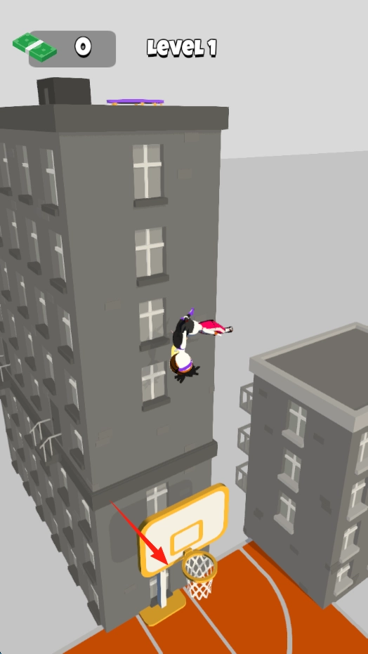 3、得分目标是从屋顶出发完成高空扣篮(入筐),以此通过“Level1”关卡,之后再去挑战更远距离、更高难度的建筑间投篮。