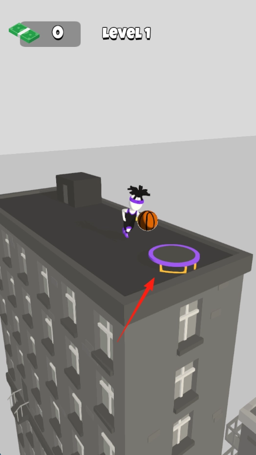 2、通过操作机制操控角色完成助跑与跳跃动作,利用蹦床(图3)之类的道具来调整扣篮的轨迹,从而避开窗户等建筑障碍。