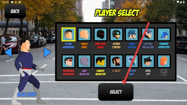 2、进入角色选择场景(PLAYER-SELECT),挑选你喜爱的角色造型,点击【SELECT】按钮,即可开启你的超级英雄街头格斗之旅。