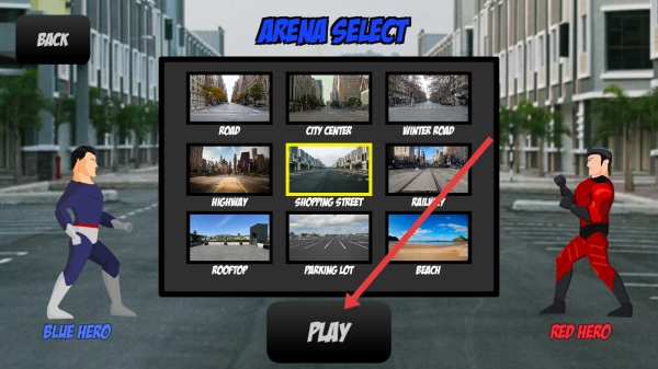 3、进入场景选择界面(ARENA-SELECT),选择想要挑战的斗场地(例如SHOPPING-STREET),点击【PLAY】按钮,即可开始街头格斗的游玩。