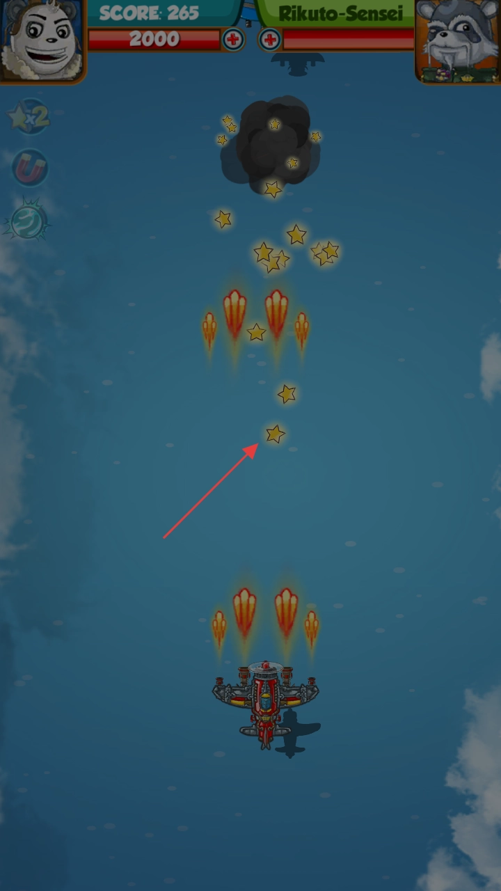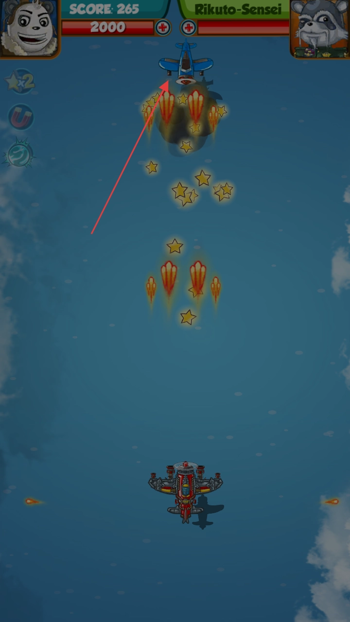2、飞行途中若遭遇敌方飞机,可借助灵活的移动操作以及磁铁等道具,全力争取更高的分数(SCORE)。