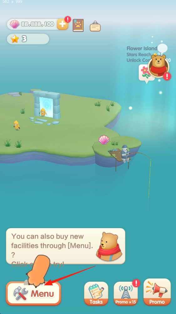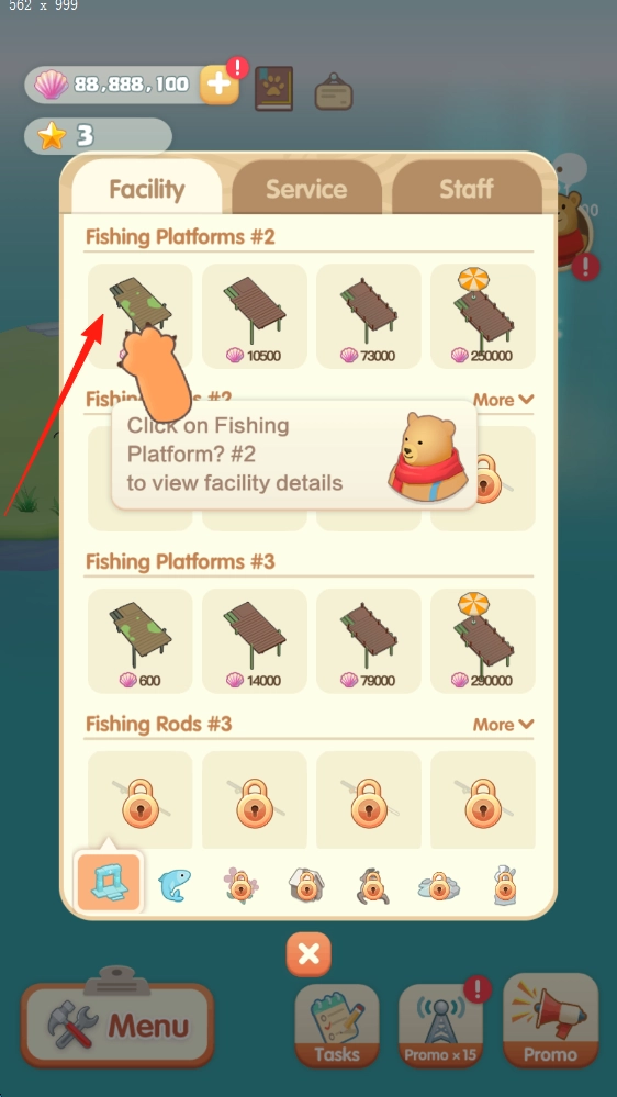 1、点击菜单,进入设施界面,选钓鱼平台,消耗贝壳,解锁新设施。