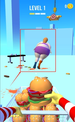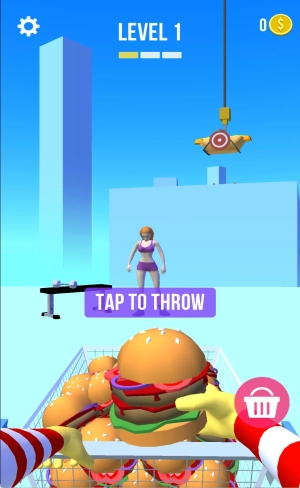 进入第一关后,留意上方移动的吊钩,找准时机把手中的汉堡精准投向移动的目标人物,完成命中操作。
