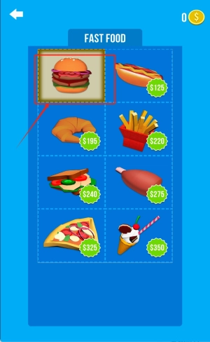 1、在商店页面浏览各类快餐的定价,红框标出的汉堡价格为125美元,点击购买后会从金币余额中扣除相应金额,当前余额将从0开始计算扣除。