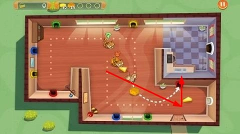2、游戏进行到中途碰到猫咪时,留意它的虚线行动轨迹,要么跟在猫咪身后,要么等它转向之后,迅速规划好路线去吃到奶酪,然后朝着出口跑去。