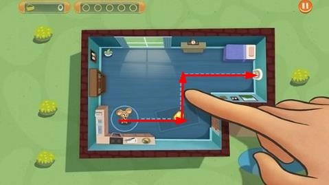 1、开启游戏的第一关教学关卡后,按照屏幕上手指指示的路线轨迹滑动操作,帮助小老鼠成功吃到奶酪并抵达出口。