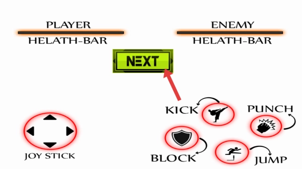3、查看界面上显示的操作设置(左侧摇杆控制移动,右侧分别对应踢击、拳击、格挡、跳跃功能),熟悉战斗的操作逻辑。