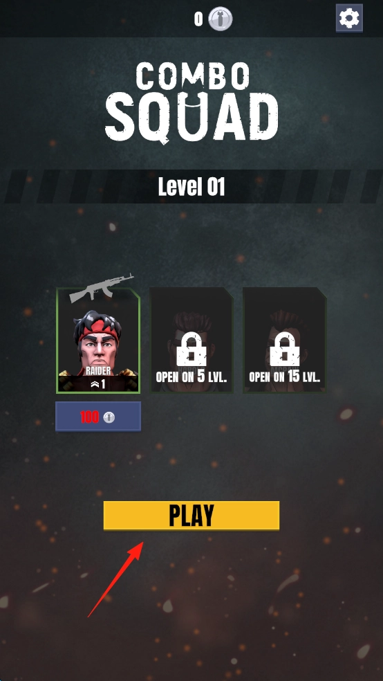 1、选择角色(Raider),点击【PLAY】按钮(红箭头所指位置),进入Level01,开启沙漠关卡的战斗。