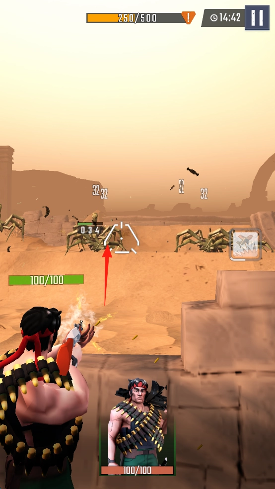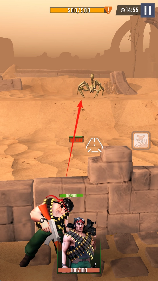 2、在场景里(红箭头所指处),对准巨型蜘蛛怪物,操控角色进行射击,留意血量情况(当前500/500),同时要避开怪物的攻击。