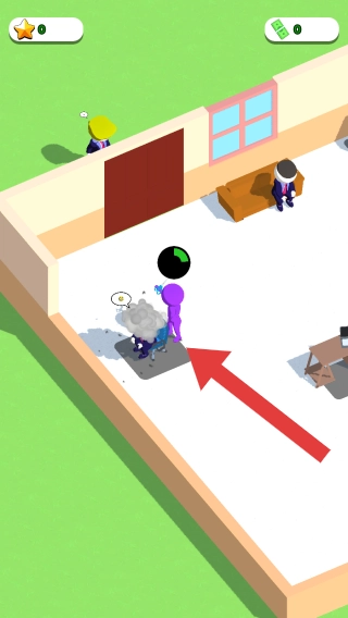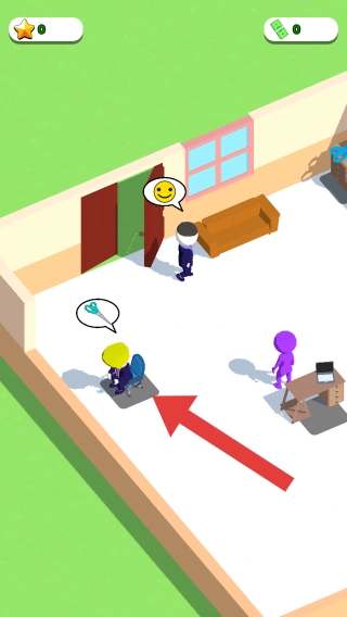 画面里有三个颜色各异的人形角色,分别是黄色、紫色和深色的。黄色角色坐在带有工具图标的位置上,紫色角色待在桌子旁边,深色角色则位于门口处。