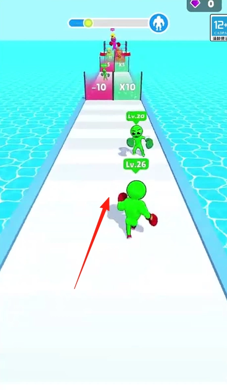 1、操控拳击手(图1红箭头所指),通过撞击同色角色提升等级(例如Lv.26),避开会造成减益效果的门(标注-10),全力冲向终点的擂台。