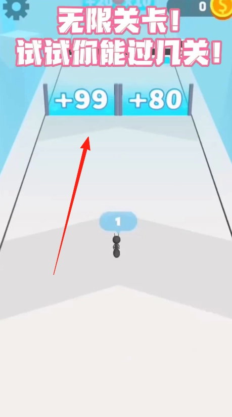 2、引导图2红箭头所指的蚂蚁,选择高增益门(+99),积累蚂蚁数量,挑战“无限关卡”,刷新闯关纪录。