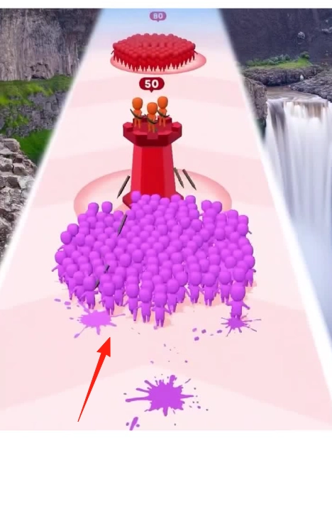 3、集结紫色人群(图3红箭头所指),攻克有50名守卫的红色塔楼,扩充己方队伍,保持推进态势,夺取更多阵地。