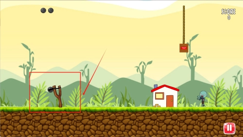 2、操作弹弓对准右侧悬挂的红色方块,拖动屏幕调整射击角度,借助抛物线原理避开房屋障碍,精准击中目标以获取分数。