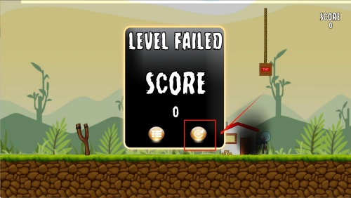 3、关卡失败后,查看界面上显示的“SCORE 0”得分提示,找到红框标注的右侧TNT图标并点击,使用炸弹道具即可清除障碍物,重新挑战当前关卡。