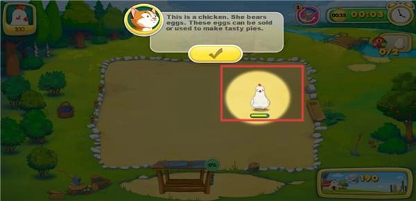2、进入游戏后先进行新手教学,你会看到一只鸡,它具备下蛋的能力,产出的鸡蛋既能够拿去售卖,也可以用来制作美味的馅饼。