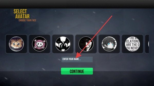1、进入【SELECTAVATAR】界面后,挑选你喜爱的头像,输入名字,点击【CONTINUE】按钮,即可完成角色创建。