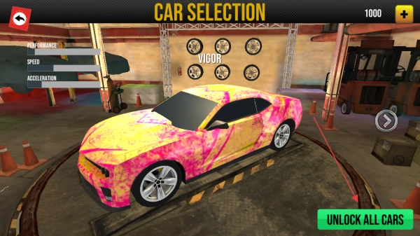 3、查看车辆性能参数(如速度等),挑选自己喜欢的赛车,也可以通过【UNLOCKALLCARS】解锁所有赛车,然后开启比赛。