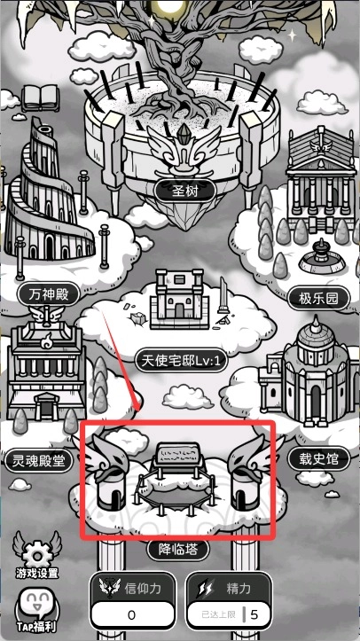 3、开始游戏后点击下方的降临塔就可以召唤天使了。