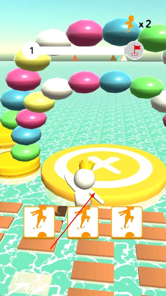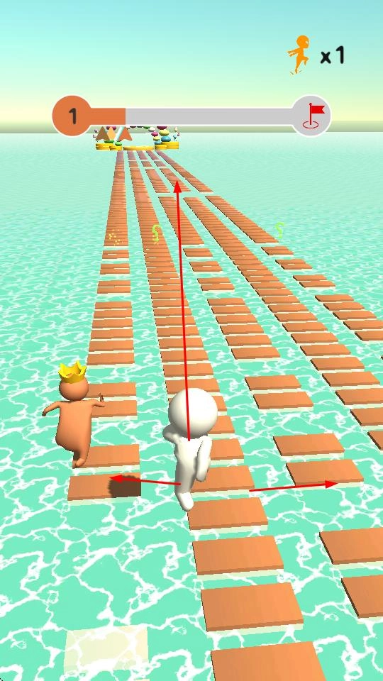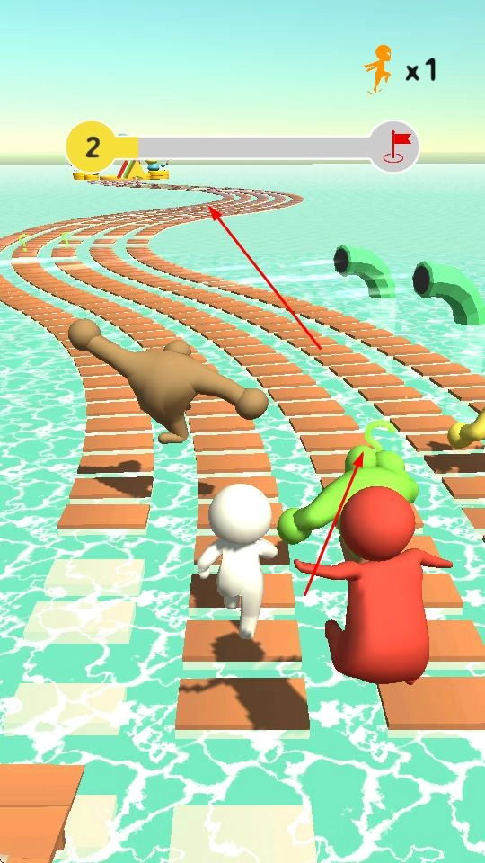 1、操控角色在水上木板路上奔跑,通过左右移动来躲避对手的碰撞,沿着直线或弯道赛道全力向终点冲刺,与对手比拼速度。