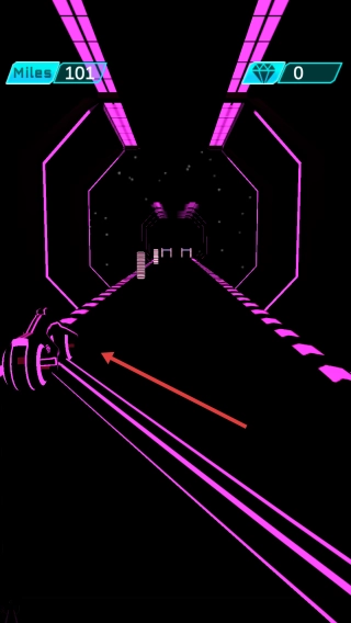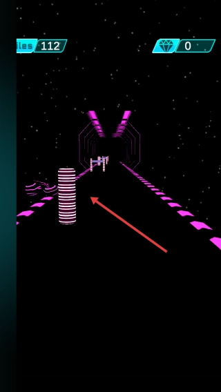 2、在霓虹隧道赛道中,通过左右滑动或按键操控摩托转向,避开圆柱、条纹路等障碍。