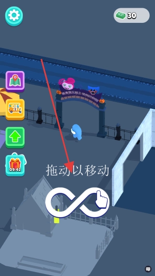 1、按照“拖动以移动”的提示拖动屏幕,操控蓝色角色进行移动,探索当前场景并熟悉地图,将目标对准建筑,为解锁或互动操作做准备。